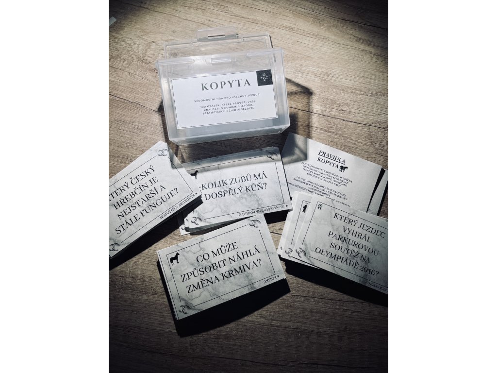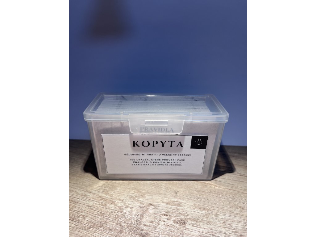 Kopyta je unikátní vědomostní hra zaměřená na svět koní, jezdectví a života se stájemi. Hra obsahuje 100 pečlivě vybraných otázek, které prověří znalosti hráčů napříč různými oblastmi.